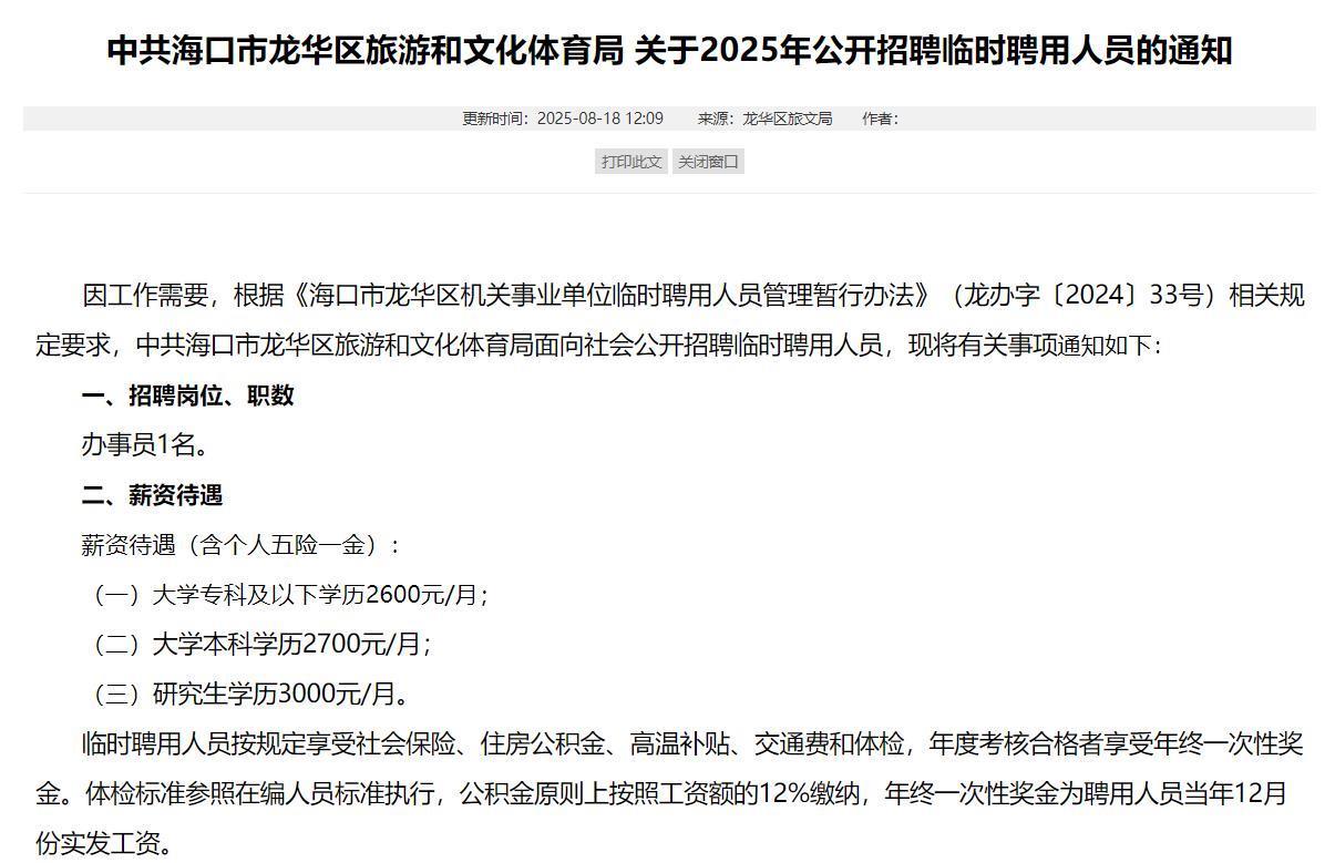 JIMU新闻记者Hu Xiuwen最近,海南省海顿市朗胡岛地区的许多部门发布了招聘公告,每月的本科生薪金为2,700元,每月薪金为3,000千元毕业生。较低的薪水和福利引起了讨论。 Haikou City在8月18日,Haikou City在2025年公共聚会的公共聚会上发布了“ Haikou Longhua区资助和资产服务中心”,并在Haikou City Longhua区的旅游,文化和文化和体育局通知公共劳动城区,公共招聘了20225年的公共招聘员工。工资福利包括五个保险和个人资金。本科生为2700个月/月,毕业的毕业生/月为3,000元。 8月11日,该网站发布了“ Haikou City Longhua区的发展与改革委员会,在公共集体EMP中宣布Loyees于2025年“。今年6月,该网站发布了“ 2025年Haikou City的Longqiao Town,Haikou City的Longqiao Town,Longhua District,Haikou City,在2025年公开聚会”,这也是同月的。Jimu News来自Longhua地区旅游和文化和体育局的记者。