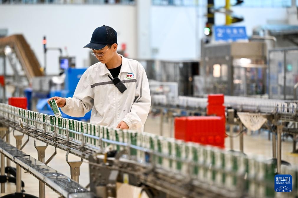 工人正在审查基于Hohhot的YILI Modern Smart Health Valley液体牛奶全球智能制造基准的乳制品包装(照片于7月28日拍摄)。