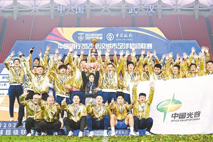 11月9日,武汉体育中心。 2025年武汉城市足球超级联赛(以下简称“汉超”)城市组决赛中,光谷队以3:2战胜蔡甸队,以八连胜加冕首届汉超城市组冠军。