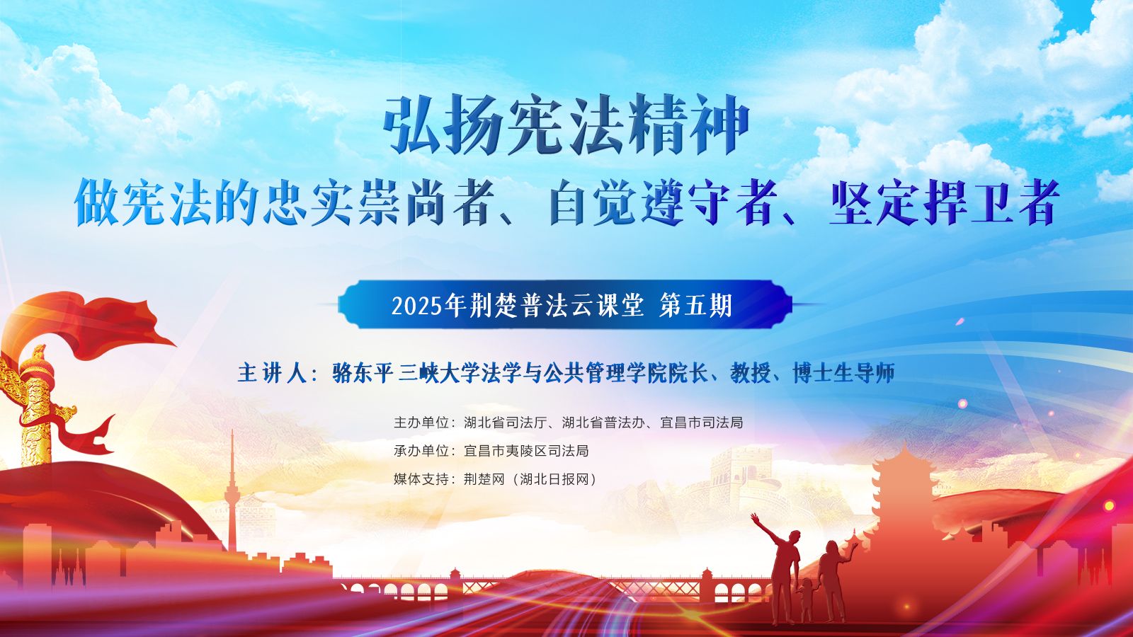 2025年第五期《荆楚普法云课堂》特邀中国三峡大学法律与公共管理学院院长、教授、博士生导师罗东平在黄百河站做“弘扬宪法精神,做宪法忠实拥护者、自觉遵纪守法、坚决捍卫者”现场讲座宜昌市夷陵区文化公园。